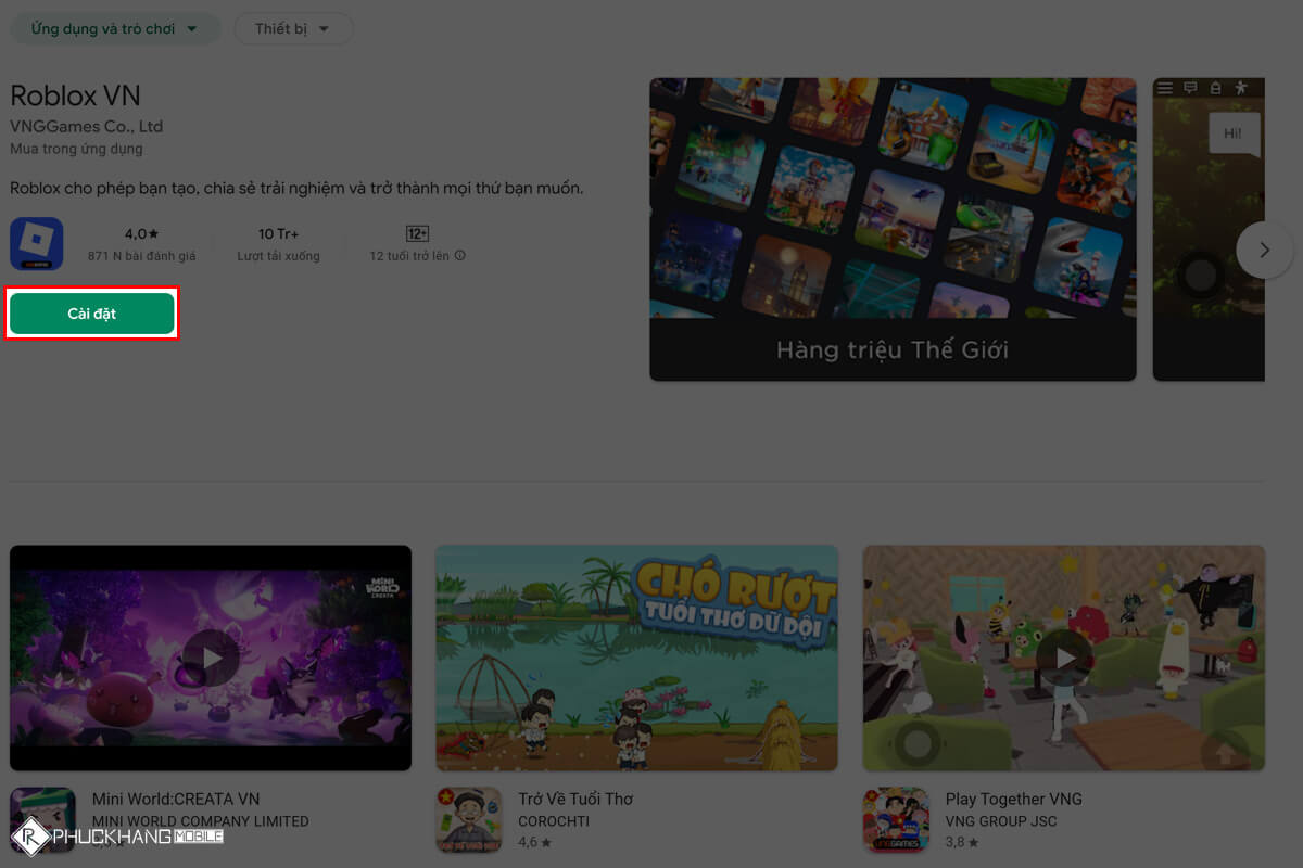 Tiếp theo, tại khung tìm kiếm trong LDPlayer, bạn hãy nhập từ khóa Roblox VN. Hãy chọn đúng ứng dụng chính thức do Roblox Corporation phát hành, để đảm bảo sự an toàn và cập nhật mới nhất. Sau đó, nhấn Cài đặt và chờ hệ thống hoàn tất tải game.